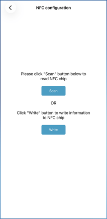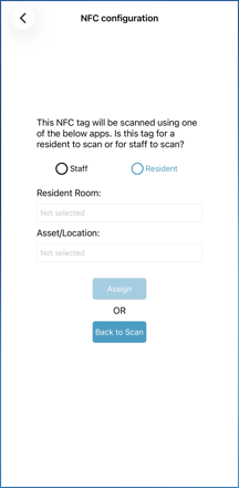 3. You will be presented with two (2) options. You can scan an existing NFC to see it's configuration or you can "write" a new configuration to a NFC tag. 3a. If you tap "Scan" it will populate the type of NFC tag it is (Staff or Resident) and the Room or Location. Use this to see where a tag is programmed! |