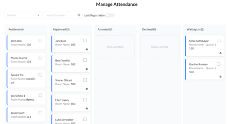 Manage Registrations and Attendance by dragging names to the appropriate column.